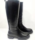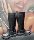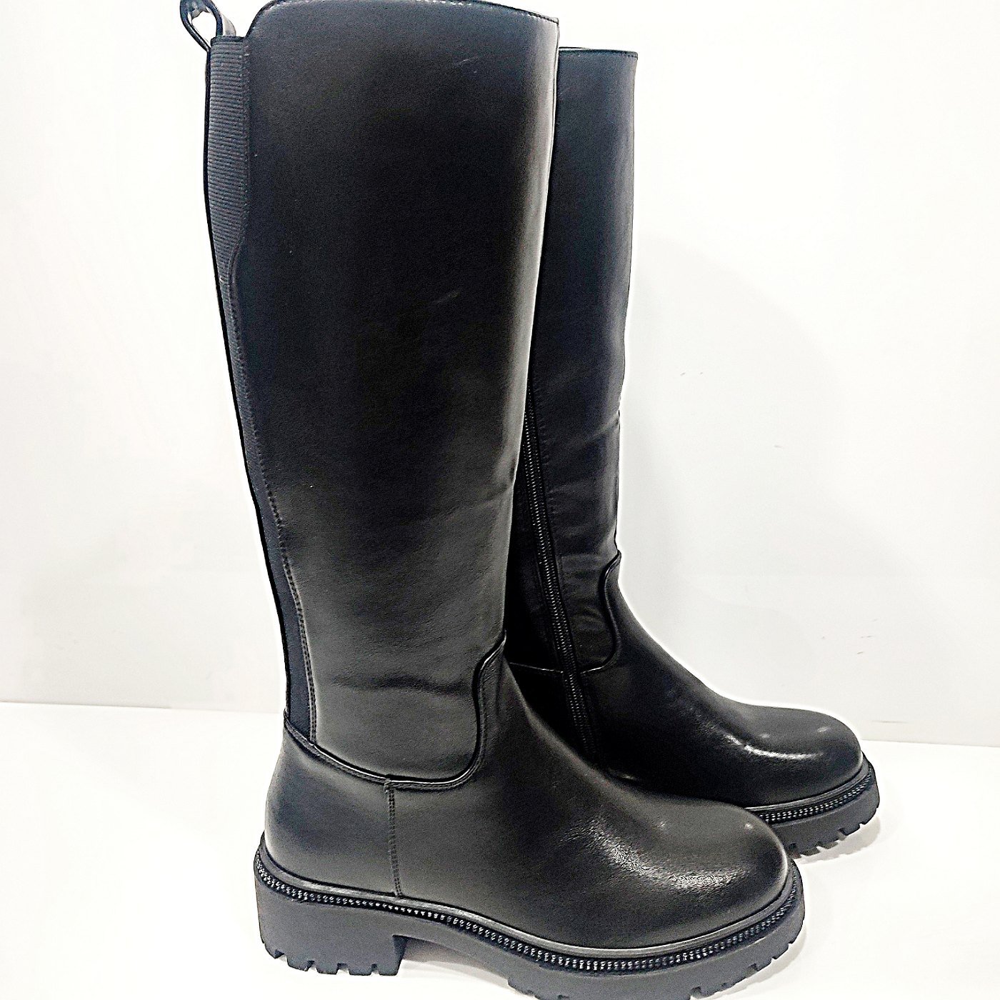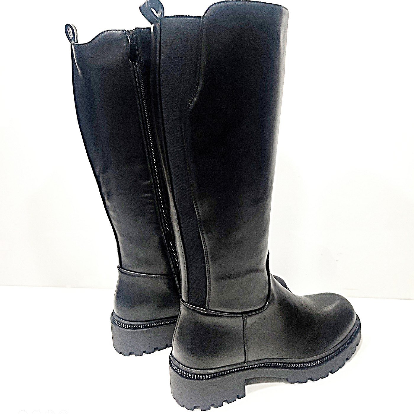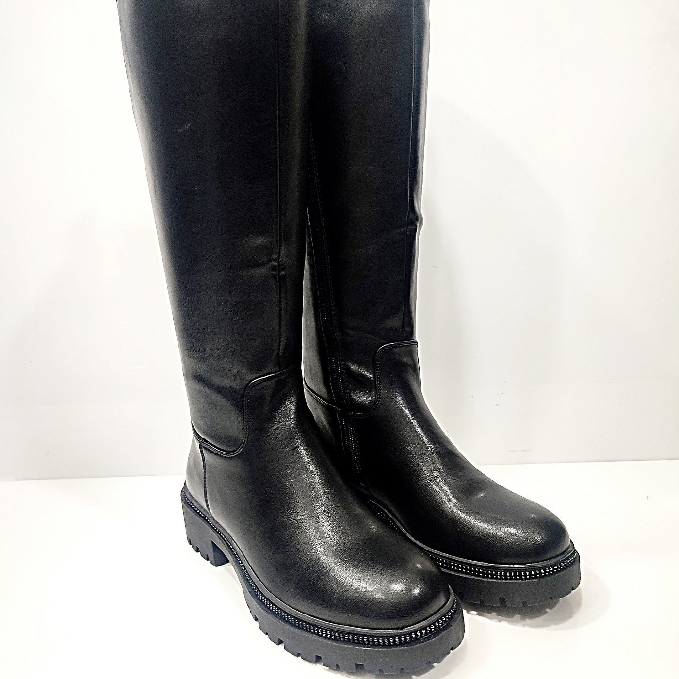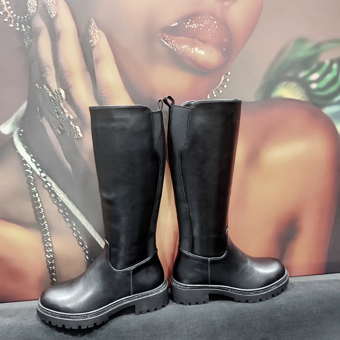 Γυναικίες μπότες έως το γόνατο σε μαύρο χρώμα με λάστιχο.στρόγγυλη μύτη μπροστα.περιμετρικά στράς σε μαύρο χρώμα.σόλα τρακτερωτή απο καουτσούκ.3,5εκ πλατφόρμα τακούνι τετράγωνο.κλείσιμο με φερμουάρ .φόρμα κανονική.