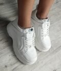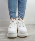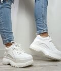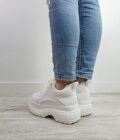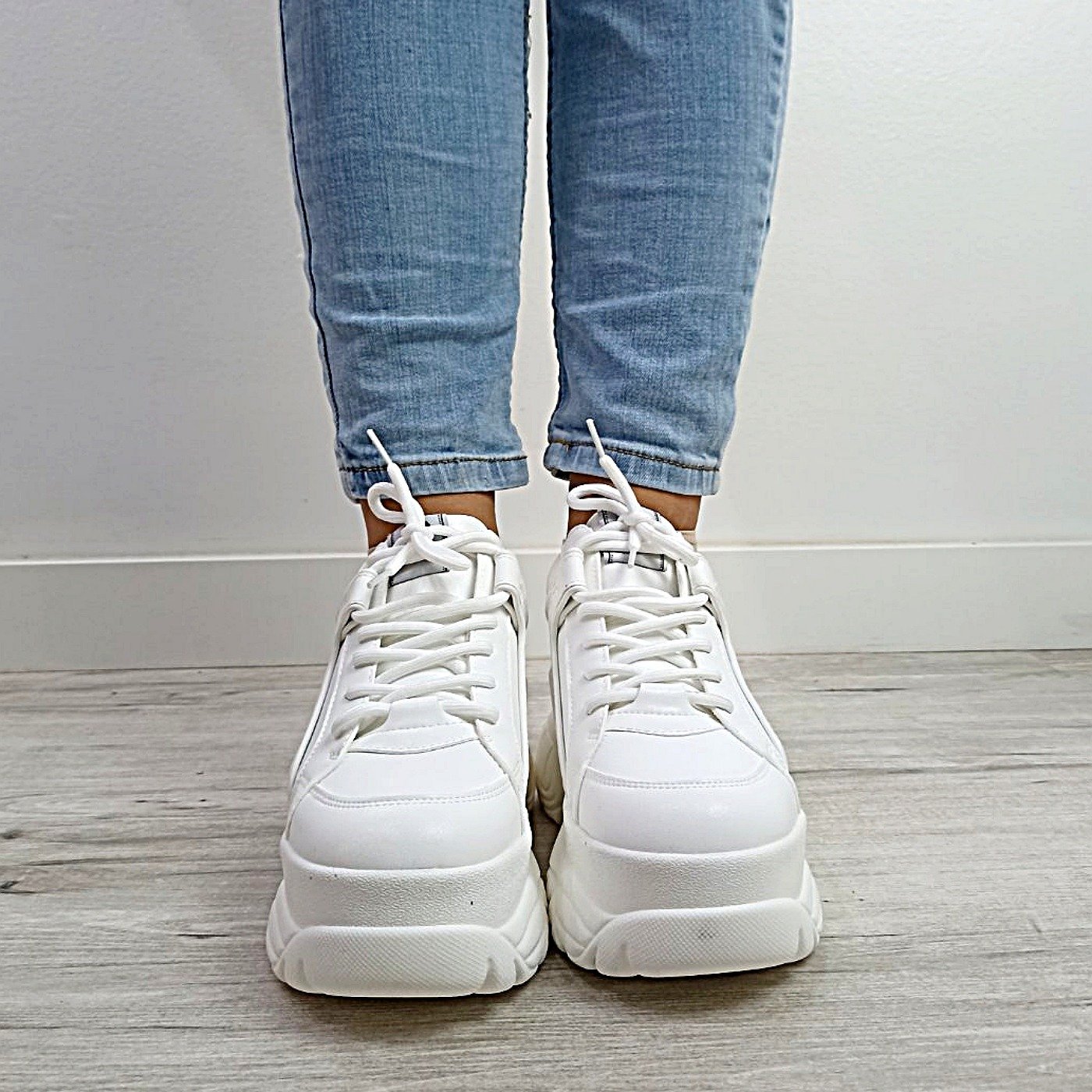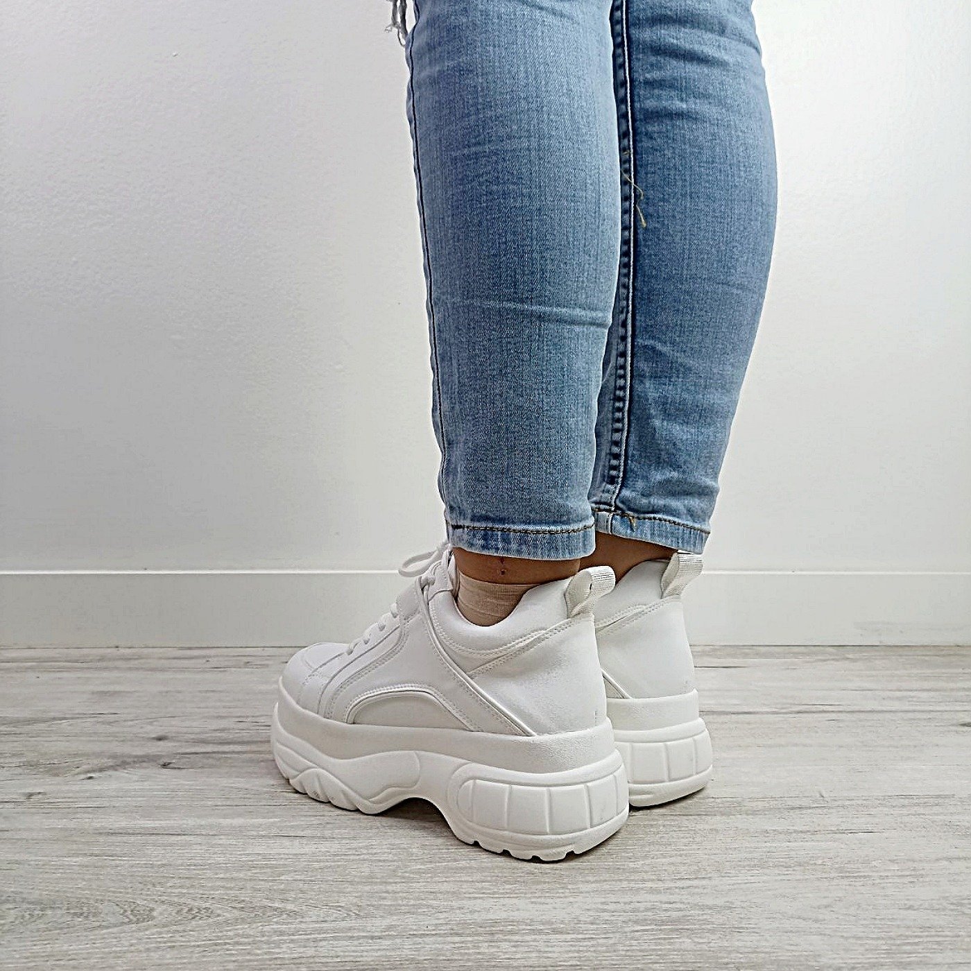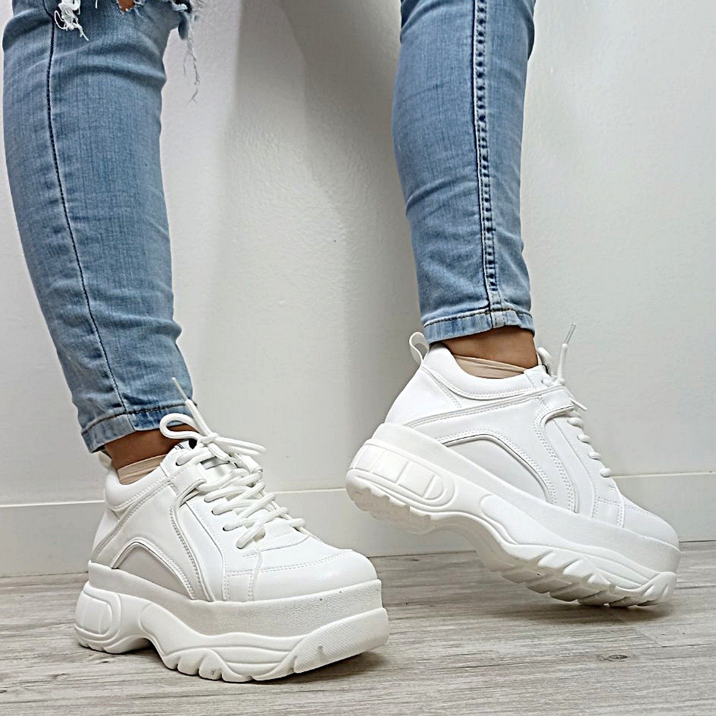 Γυναικεία δίπατα sneakers λευκά με κορδόνια. Με μαλακό πέλμα και πολύ ελαφρύ στο βάδισμα. Ύψος σόλας 6 εκατοστά. Φόρμα κανονική.