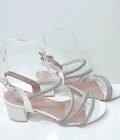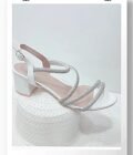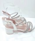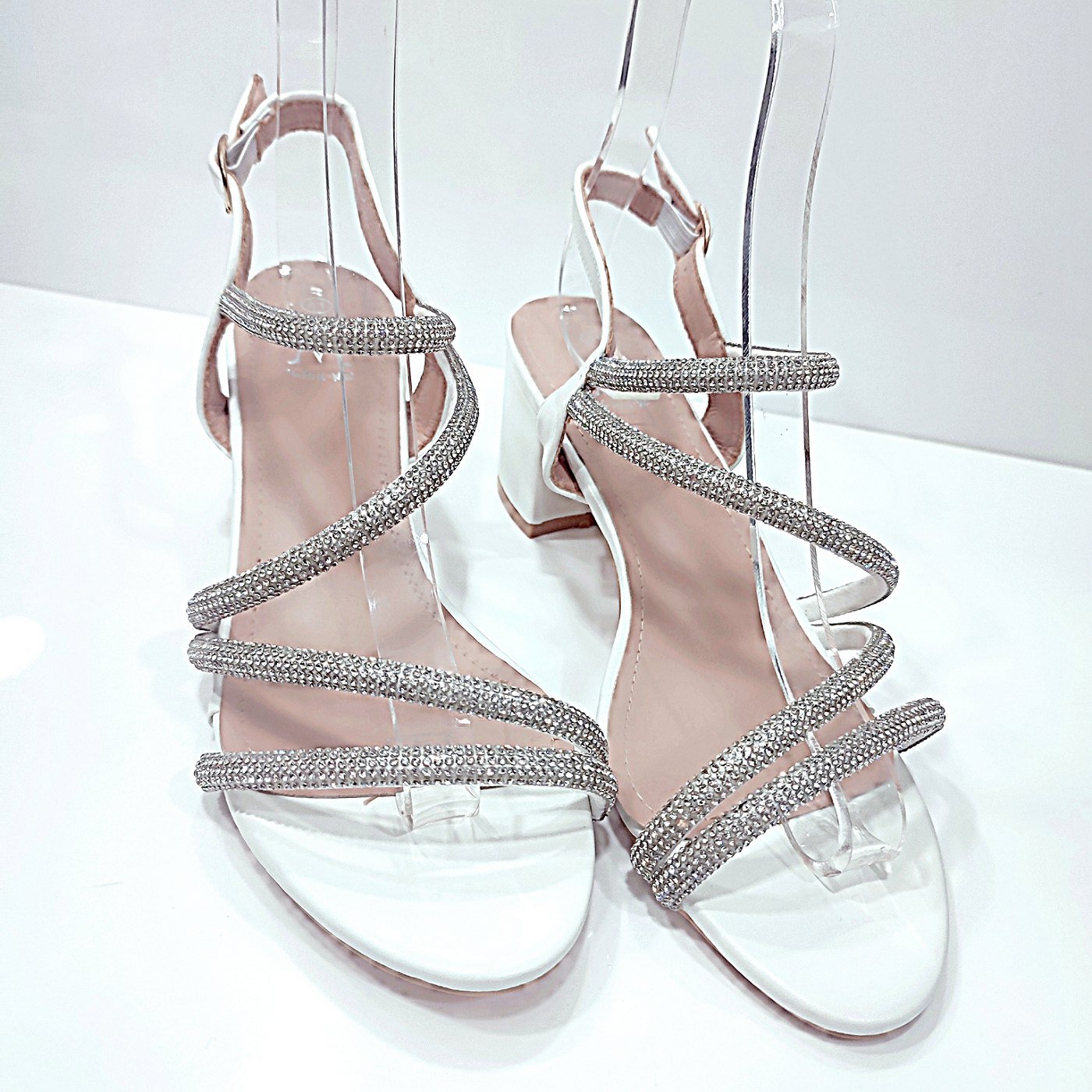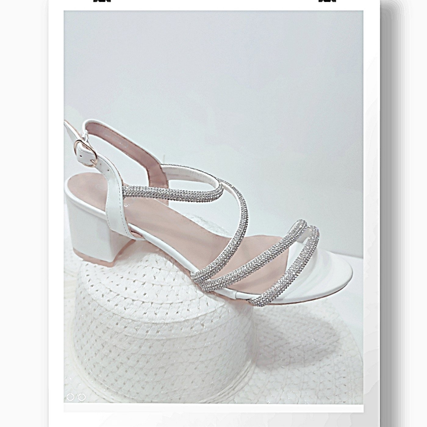 Γυναικεία πέδιλα με τετράγωνο τακούνι(ύψος 6,5εκ).σε λευκό χρώμα.δέσιμο με μπαρέτα.ειδικό ενσωματωμένο μαξιλαράκι,αντιιδρωτικό πέλμα.έχει δύο φάσες απο strass για να αγκαλιαζει το κουτουπιέ