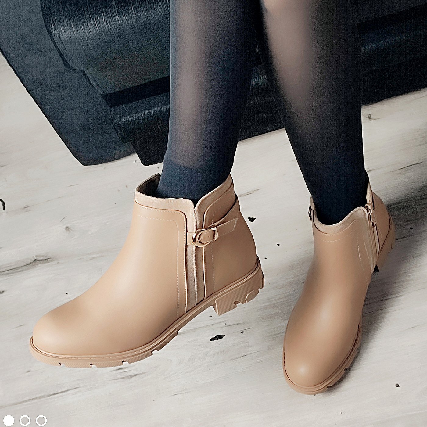 Γυναικεία υπερμέγεθη μποτάκια αστραγάλου,μπεζ με εσωτερικό λειτουργικό φερμουάρ και διακοσμητική τόκα με δυνατότητα αυξομείωσης και suede λεπτομέρειες. Ισοθερμική επένδυση και αντιολισθητική σόλα. Ύψος τακουνιού 3 εκατοστά. Φόρμα κανονική.