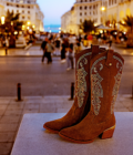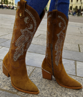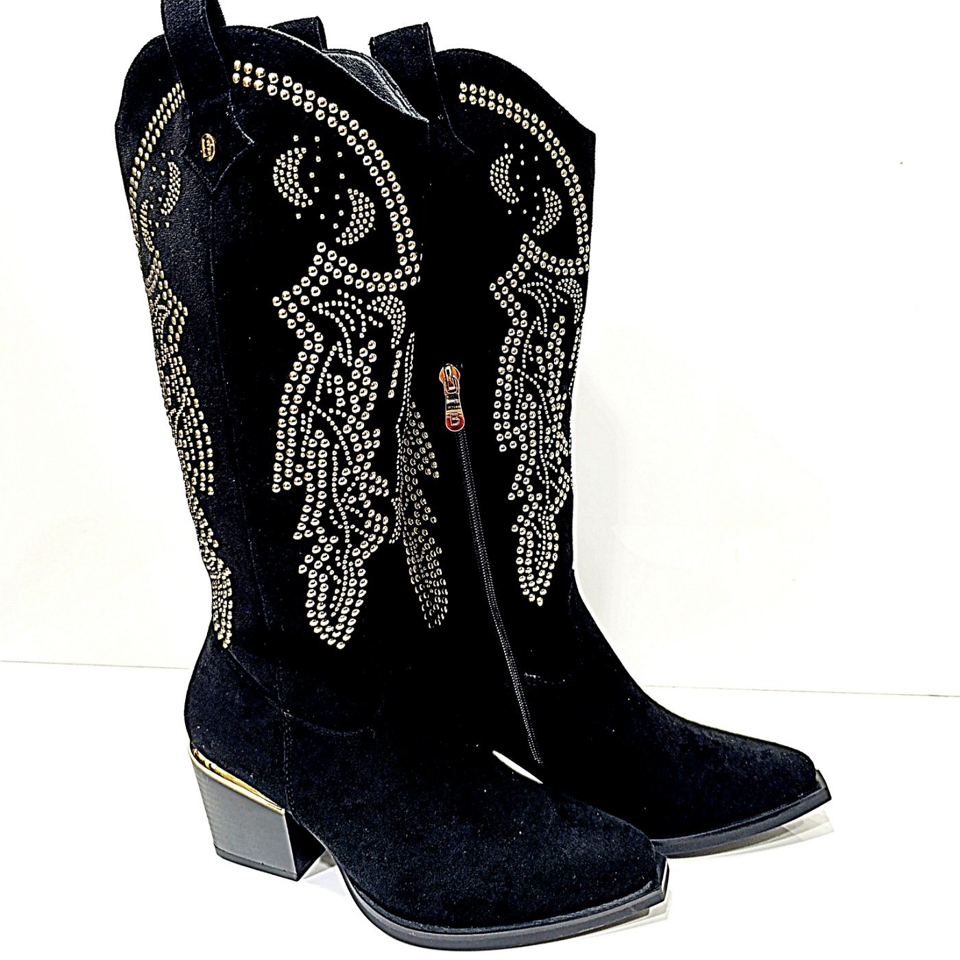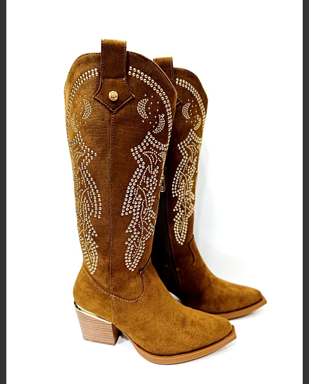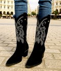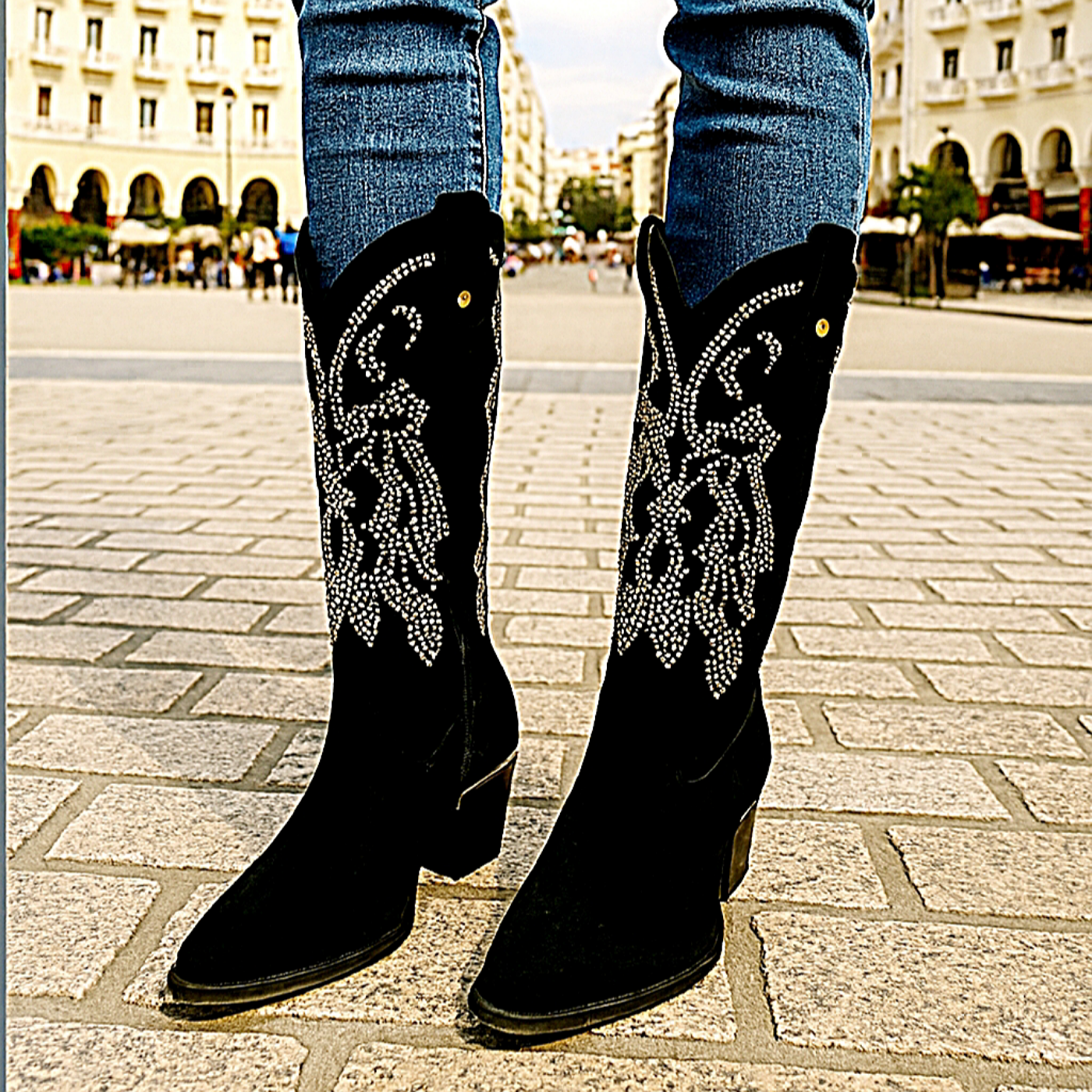 Cowboy Μπότες Κάμελ & Μαύρη. Οι Μπότες Cowboy είναι η τέλεια επιλογή για το φθινόπωρο και τον χειμώνα, προσφέροντας έναν μοναδικό συνδυασμό western αισθητικής και μοντέρνου στυλ. Με ύψος τακουνιού 7 εκ. και συνολικό ύψος παπουτσιού 40εκ. , αυτές οι Μπότες προσφέρουν την κατάλληλη ανύψωση και στήριξη. Το φερμουάρ διευκολύνει την εφαρμογή, και το suede δέρμα μαζί με τη μυτερή μύτη ολοκληρώνουν το εντυπωσιακό design αυτών των μποτών.