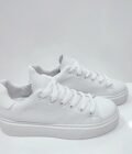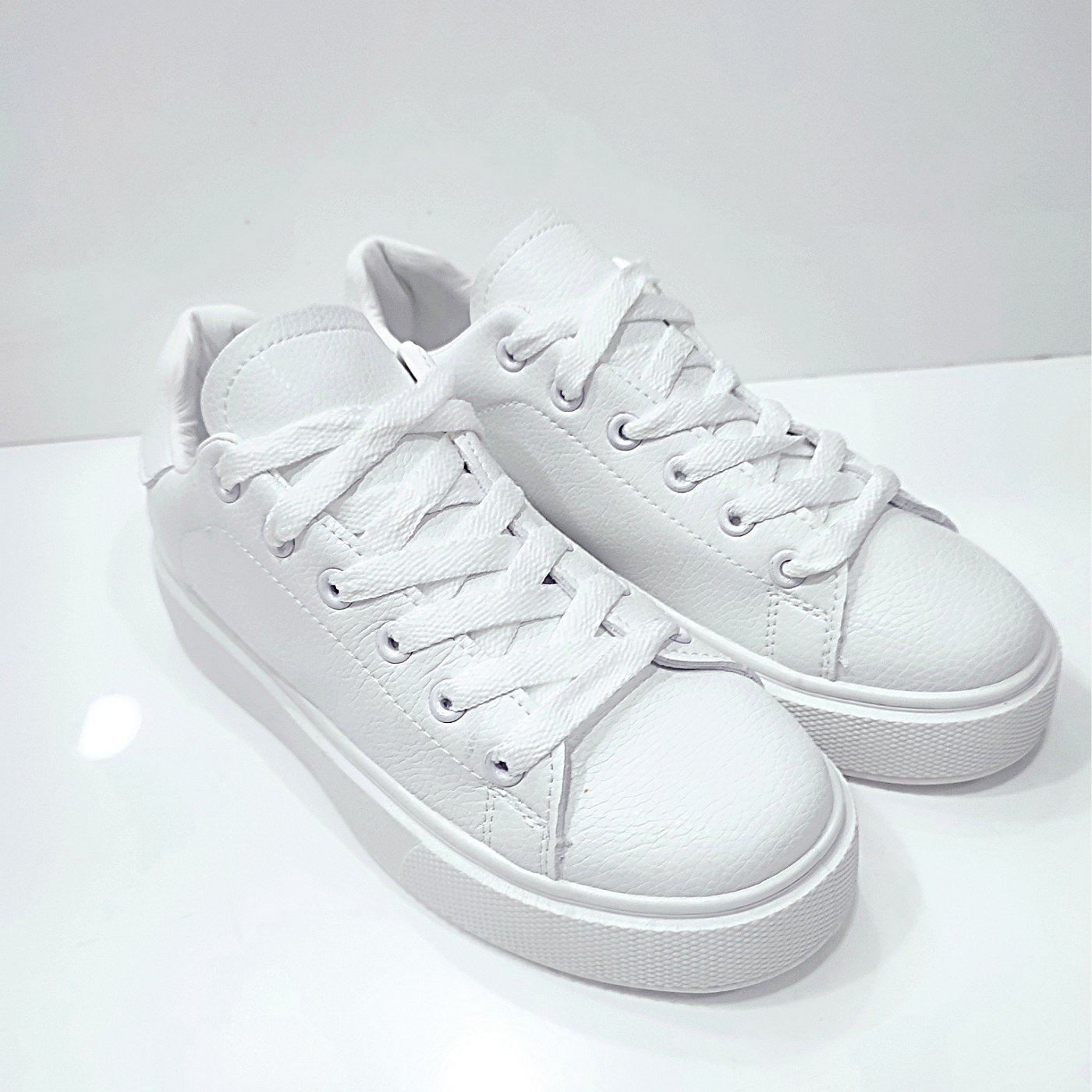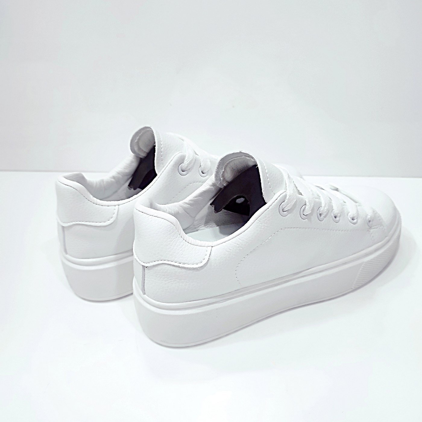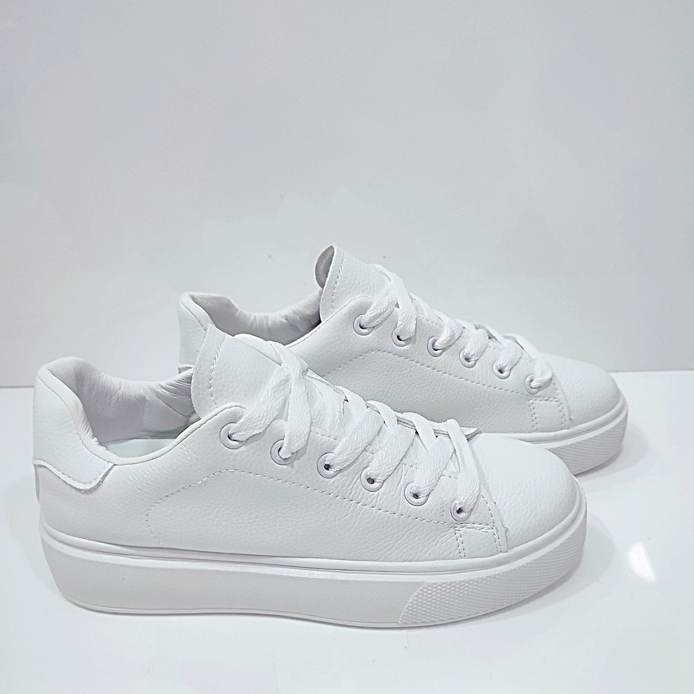 Λευκό sneaker με κορδόνι.μαλακό οικολογικό δέρμα που δεν σπάει.διαιρούμενος πάτος.ίσια δίπατη σόλα(ύψος 3,5εκ).αντιολισθητικη σόλα.μαλακό στο πάτημα για μεγαλύτερη άνεση στο περπάτημα και στην ορθοστασία.φόρμα κανονική