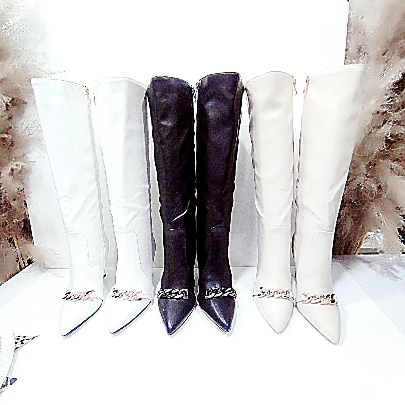 Μπότες μαύρες γονάτου με μεσαίο τακούνι και εσωτερικό λειτουργικό φερμουάρ,στο τελείωμα του μύτη και αλυσίδα η οποία αφαιρείται τεχνικά.ισοθερμική επένδυση. μαλακό οικολογικό δέρμα(δεν σπάει)σταθερό τακούνι(υψος 9εκ).Φόρμα κανονική.