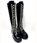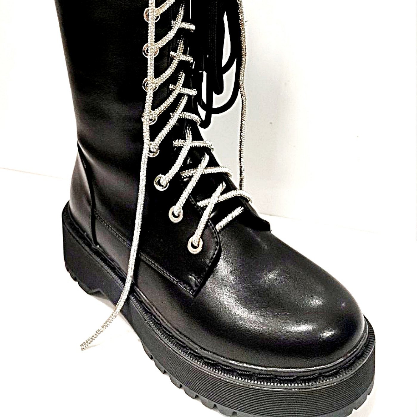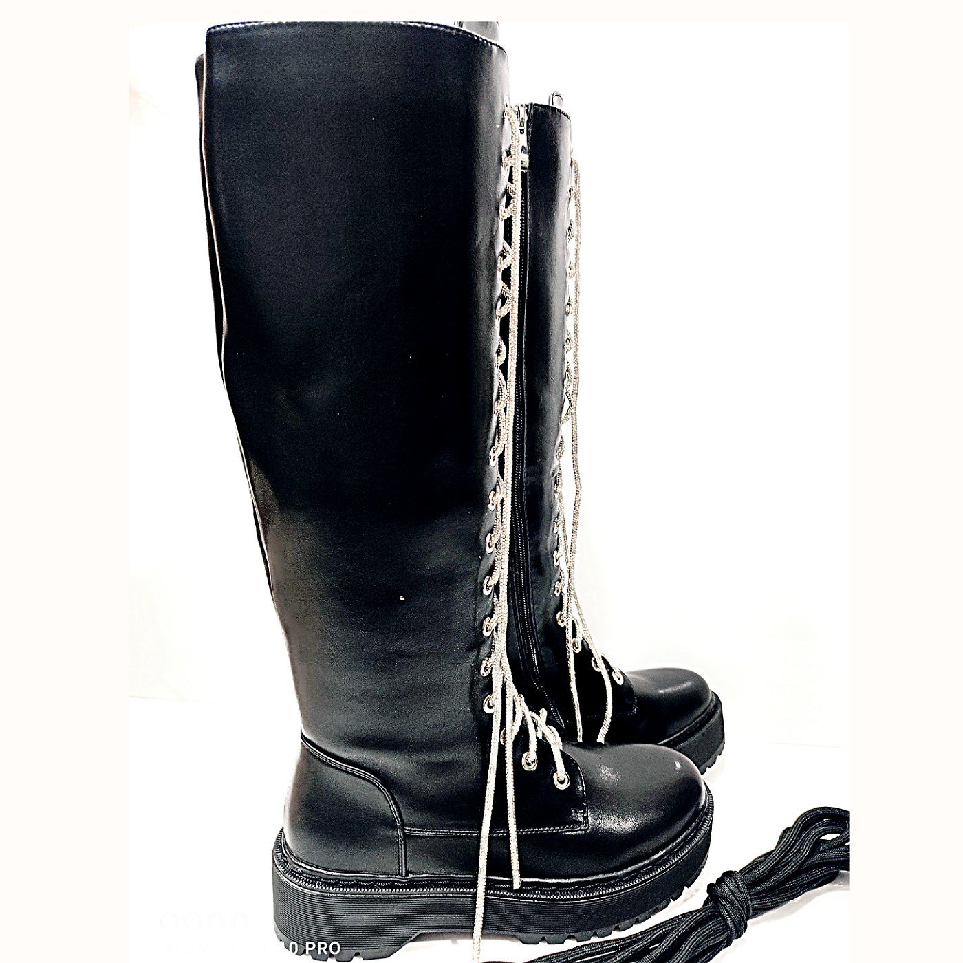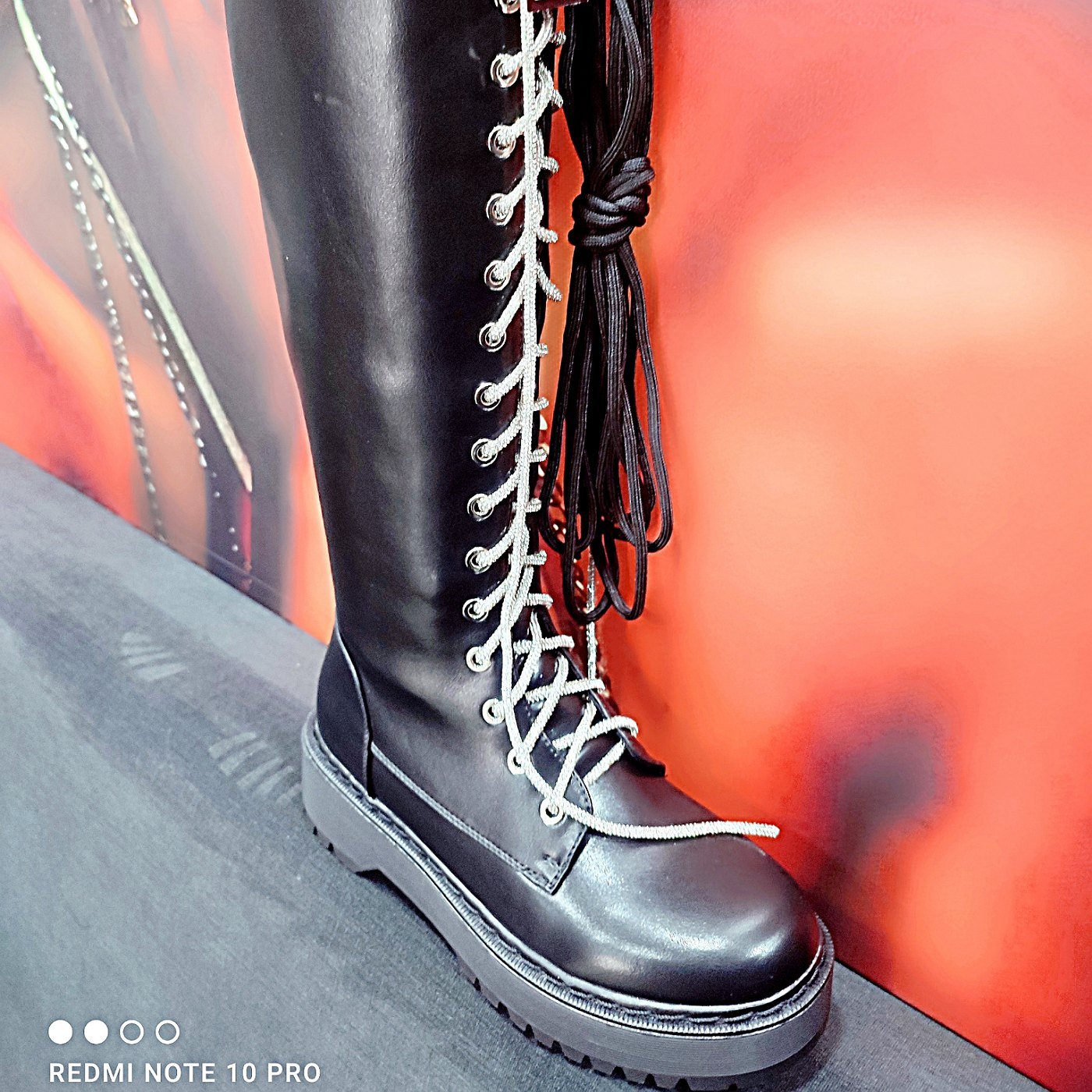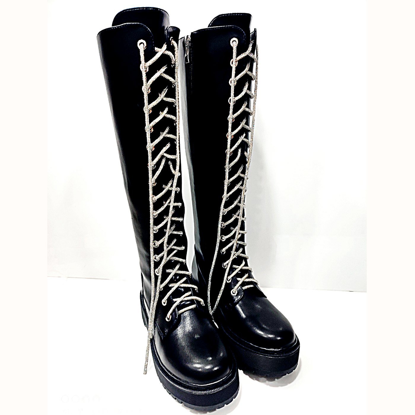 Ψηλές μπότες σε απόχρωση μπέζ&μαύρο με σύστημα κλεισίματος διπλό κορδόνι απλο και με στράς για να ταιριάξει απόλυτα σε κάθε σας εμφάνιση.διαθέτει πλατφόρμα ύψους 2,5εκ & τετράγωνο τακούνι ύψους 4εκ.τρακτερωτή και με καουτσούκ σόλα.επένδυση εσωτερική.στρόγγυλη μύτη για την πιο εντυπωσιακη κομψή σας εμφάνιση.φόρμα κανονική.
