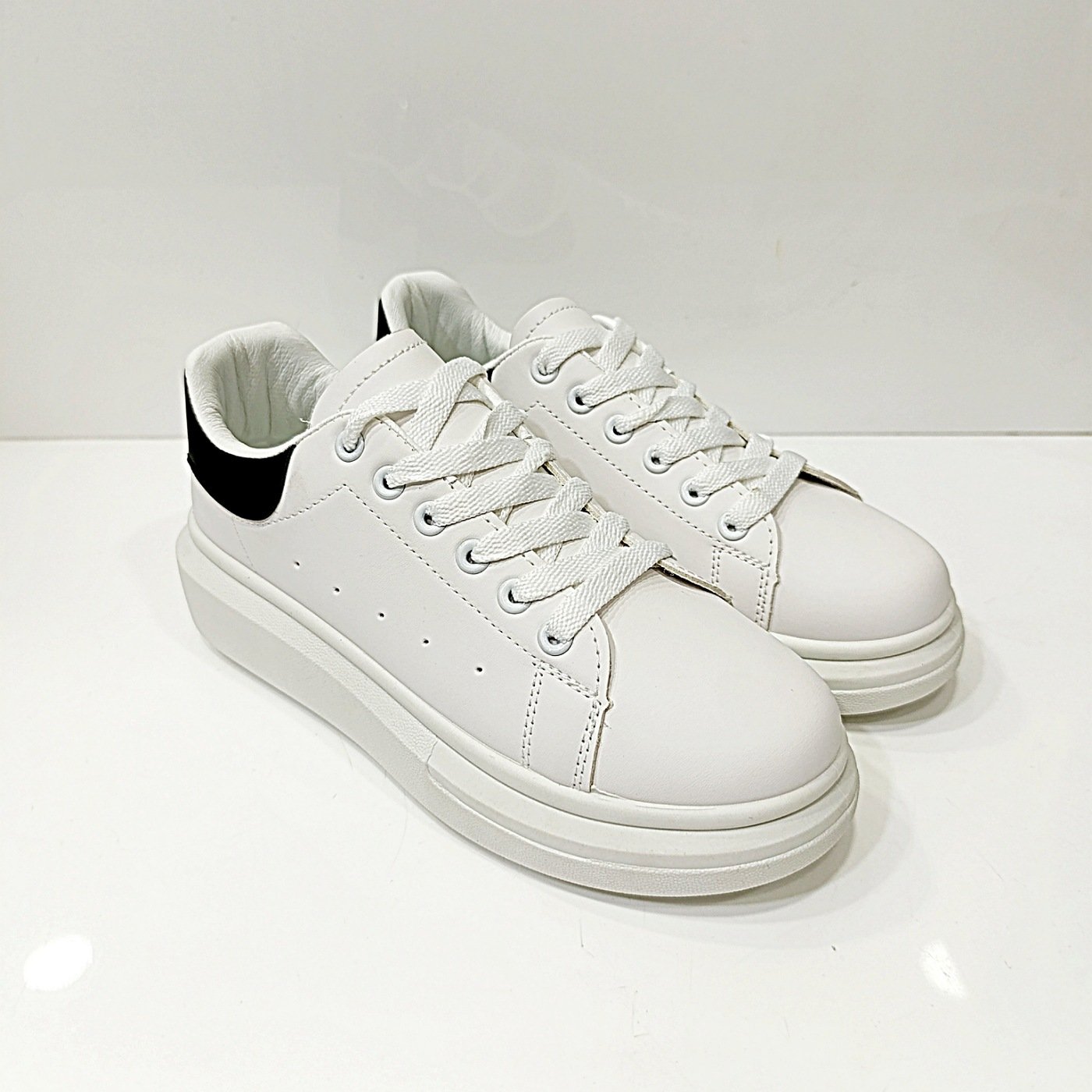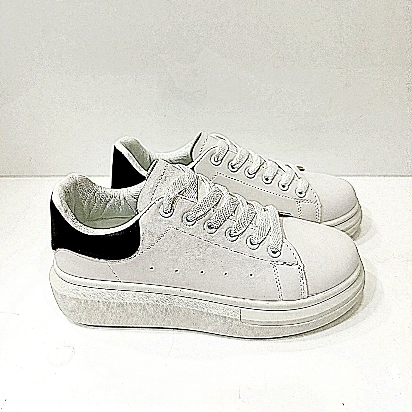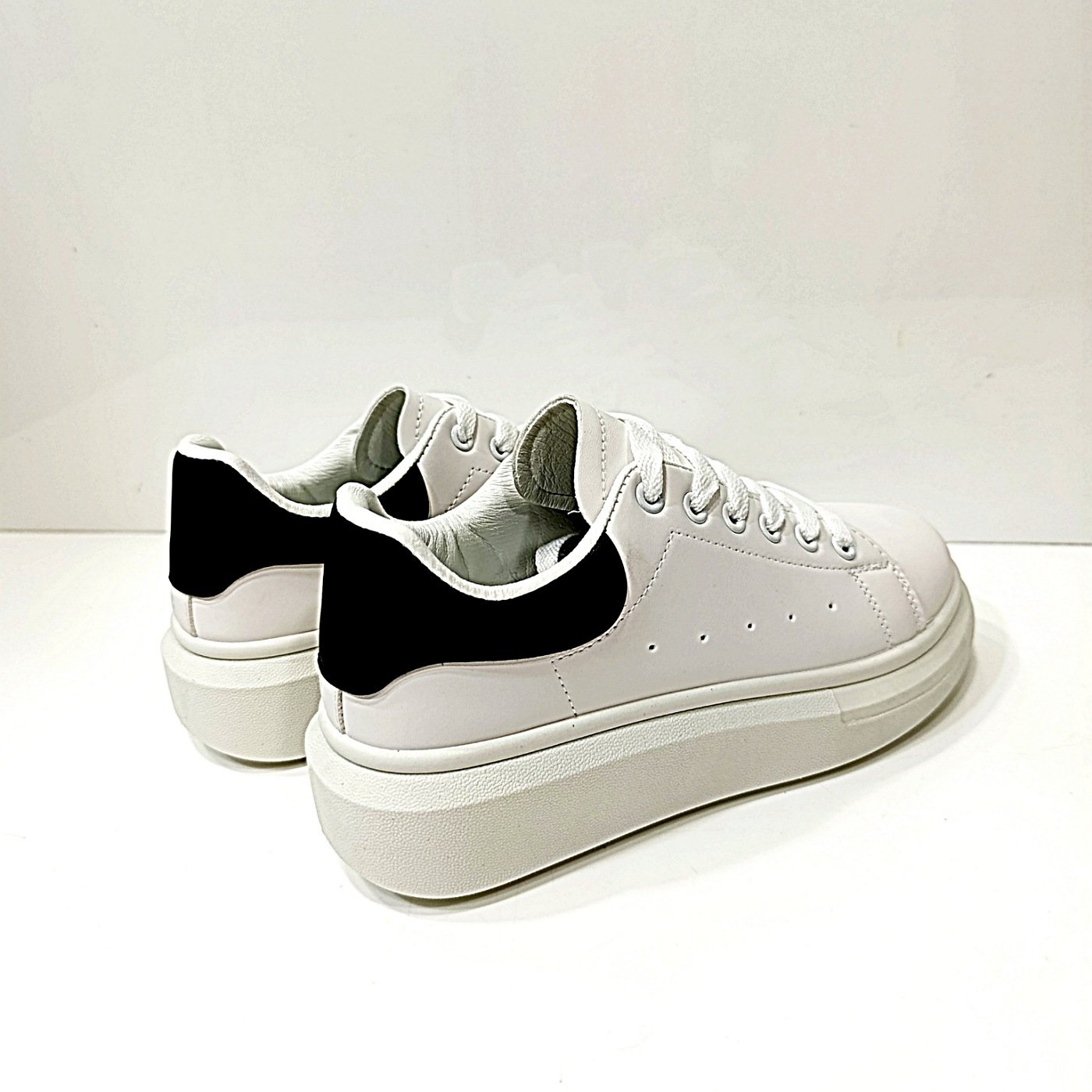 Sneakers δίσολα σε συνδυασμό χρωμάτων.λεύκα sneakers με μικρή λεπτομέρεια στο πίσω μέρος σε μαύρο χρώμα.διαθέτει μαλακό,διαιρούμενο πατάκι.στην εξωτερική πλεύρα του παπουτσιού είναι διάτρητο για καλύτερη αναπνοή του ποδιού.κλείσιμο με κορδόνι.δίσολο 4εκ πίσω 2εκ μπροστά με ελαστική σόλα από καουτσουκ για σταθερό άνετο βάδησμα.στρόγγυλη μύτη.Μια άνετη και στιλάτη επιλογή που θα σας συντροφεύει μοναδικά σε κάθε casual εμφάνιση σας.φόρμα κανονική.