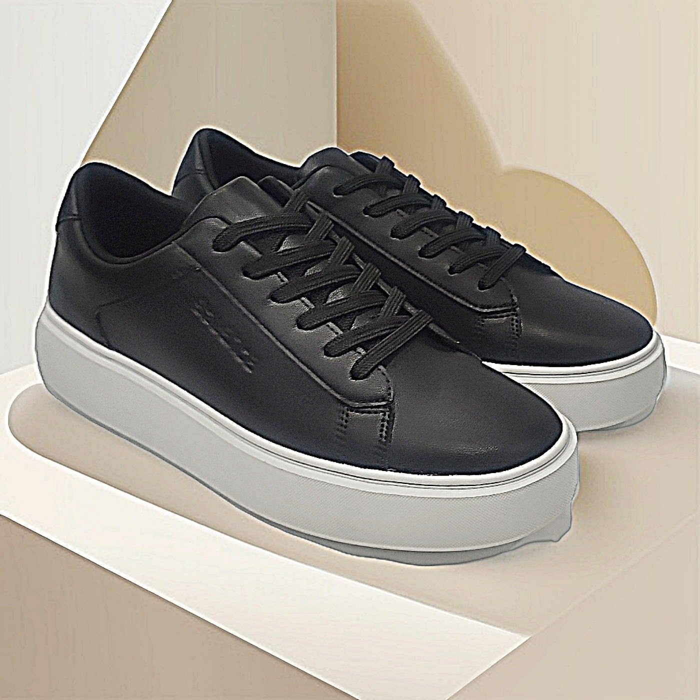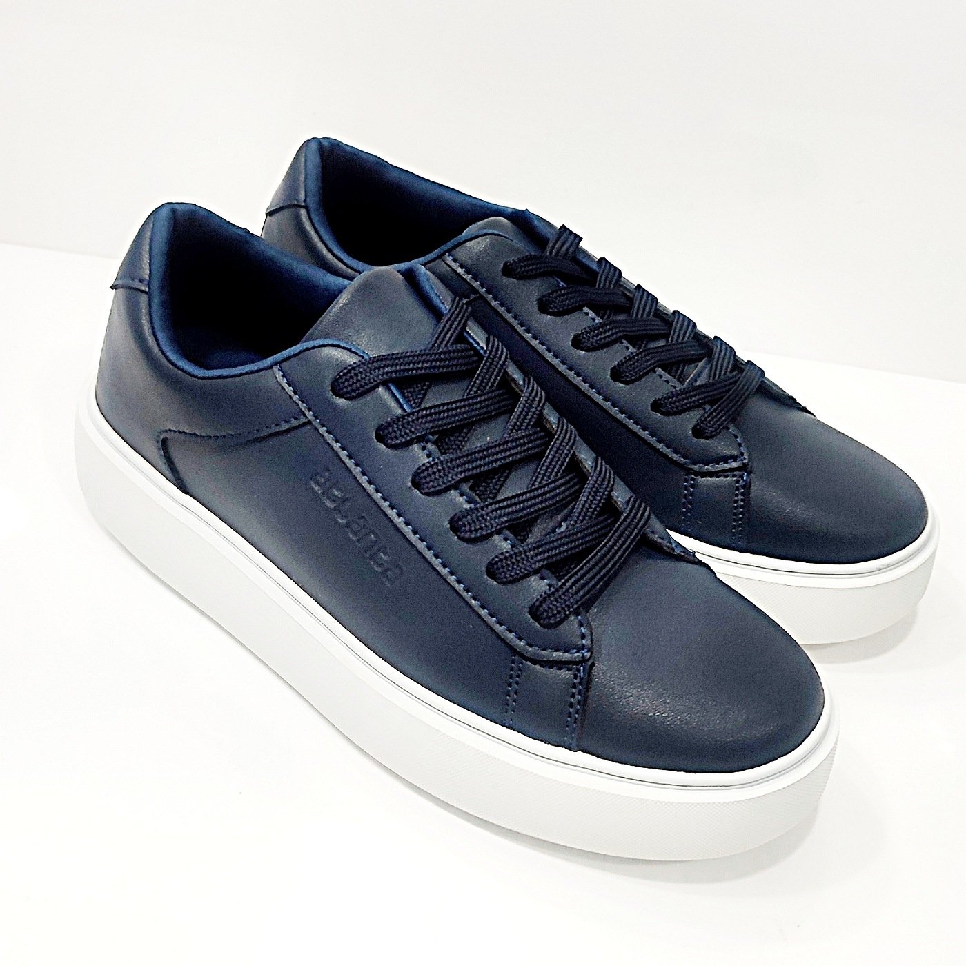 Sneakers με επίπεδη σόλα ύψος 4εκ σε ουδέτερο λευκό χρώμα που σου δίνει την δυνατότητα να το συνδυάσεις με περισσότερα χρώματα.Στο επάνω μέρος όλη επιφάνεια σε σκούρο μπλέ μάτ χρώμα.Δέσιμο με κορδόνι για καλύτερη εφαρμογή.